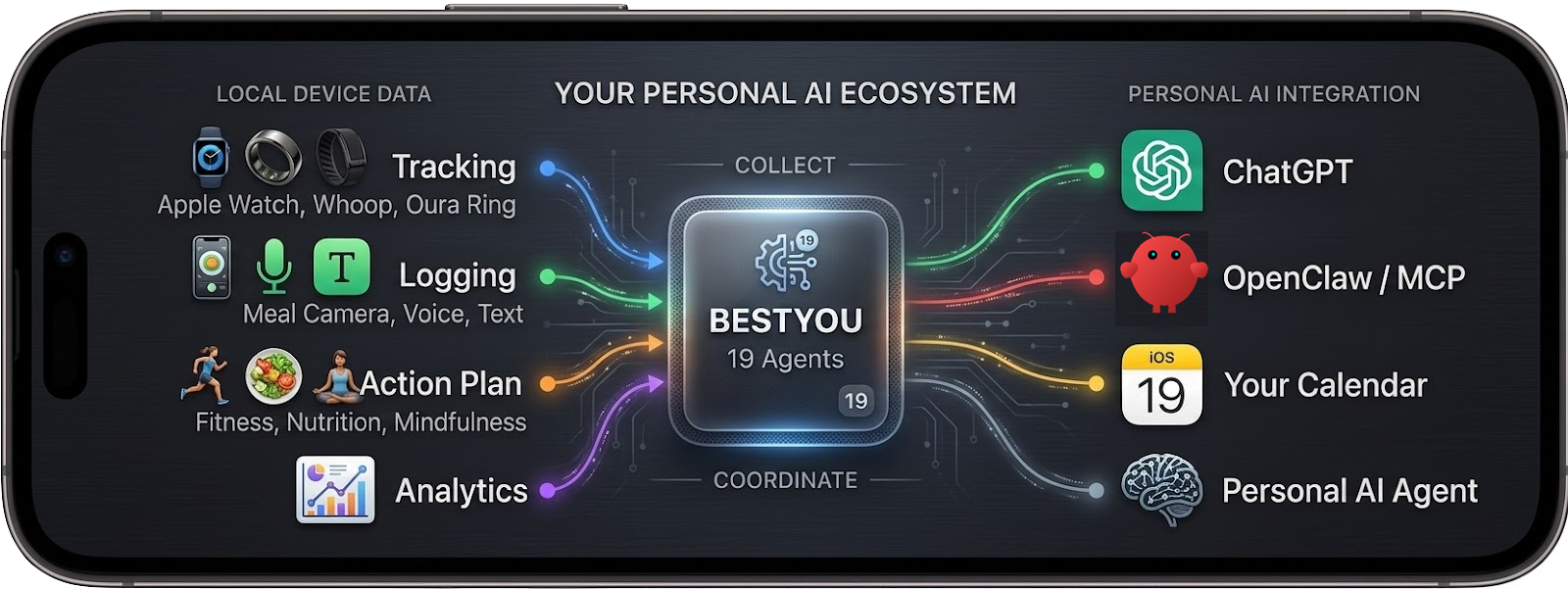 BestYou deploys 19 specialized health agents on your device — collecting what cloud AI can't access, synthesizing it into an Action Plan, and coordinating with your personal AI.