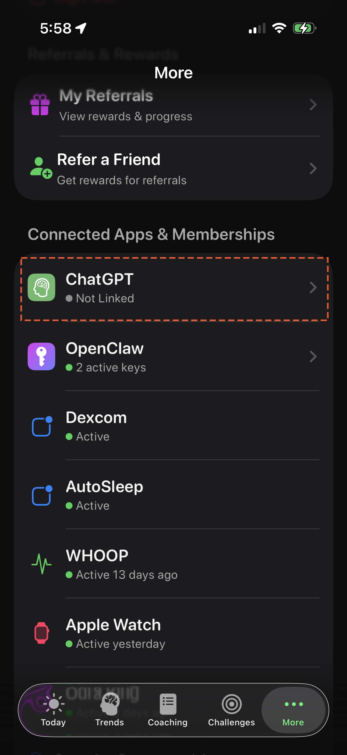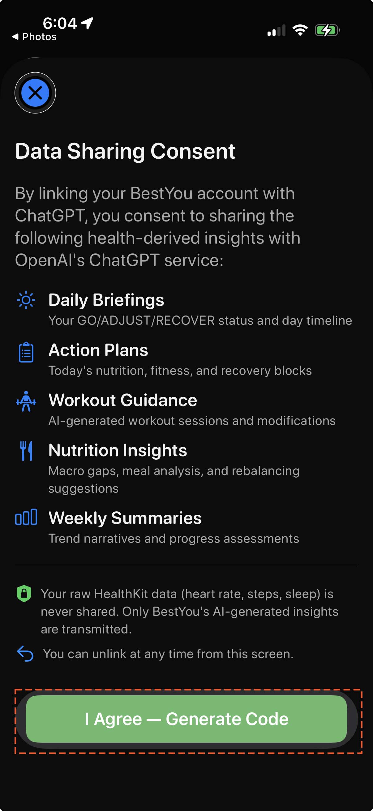 Open the BestYou Health Coaching GPT in ChatGPT and connect it with your 8-character code. Once linked, ChatGPT can access your daily briefings, action plans, workout guidance, and nutrition insights — processed intelligence from 19 on-device agents, not raw data.