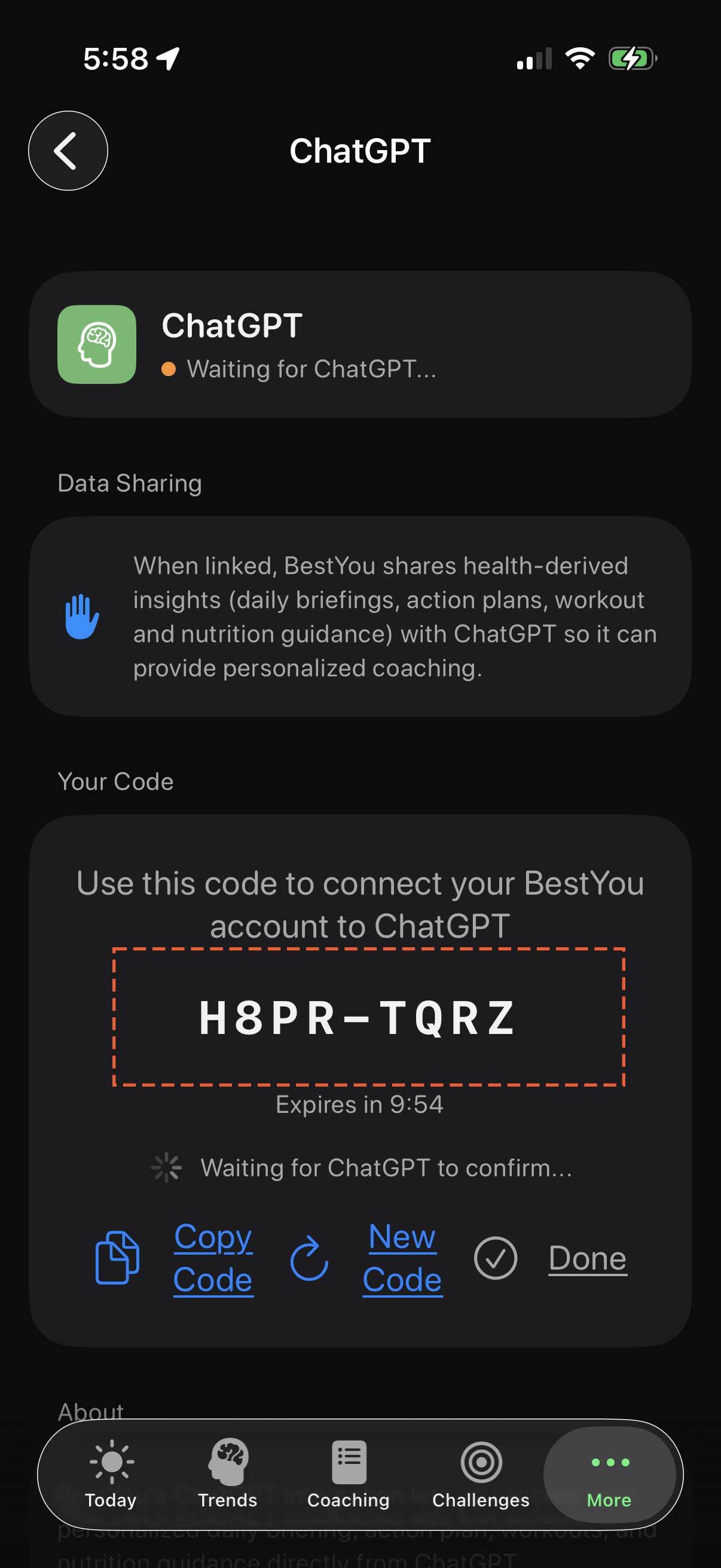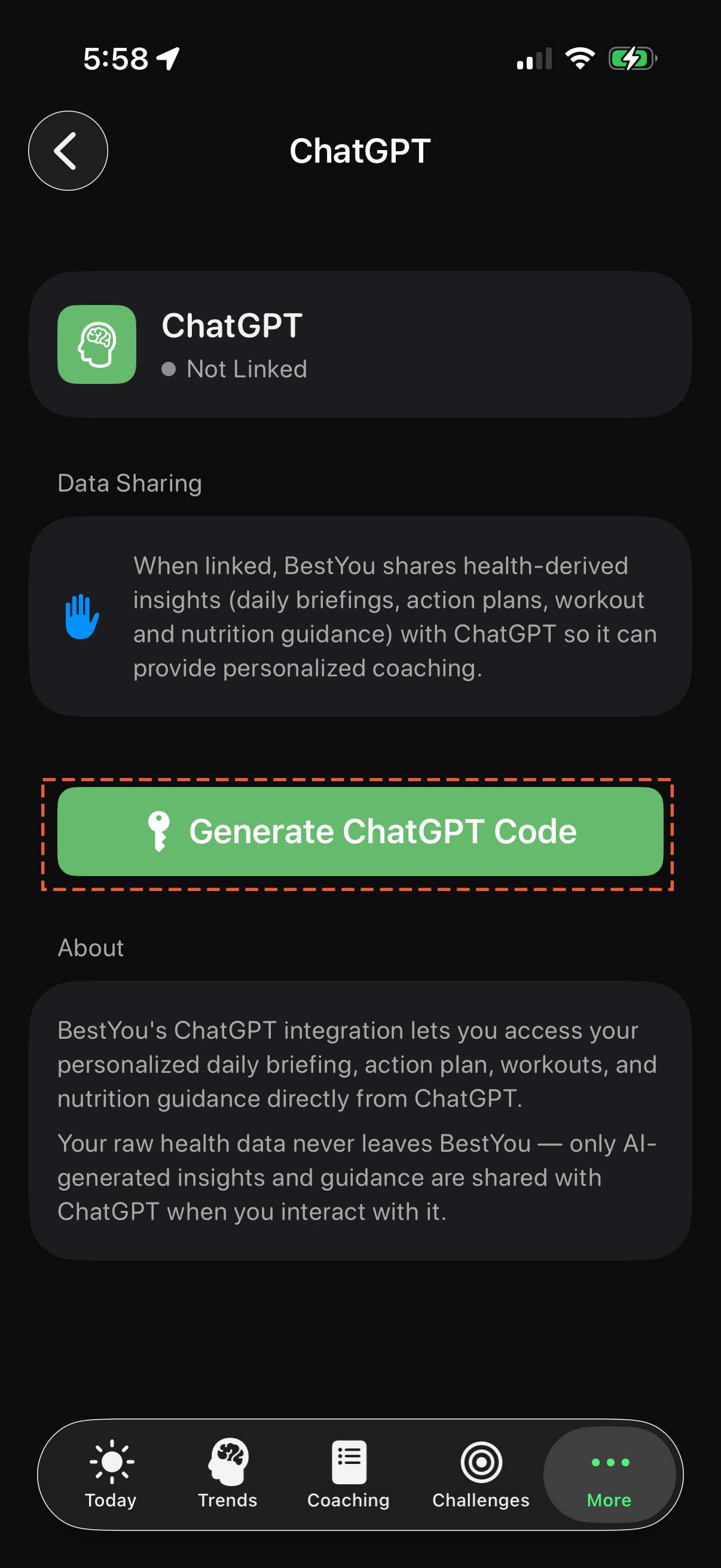 In the BestYou app, go to More, Connected Apps, ChatGPT and tap "Generate ChatGPT Code." Review the data sharing consent, then agree to generate an 8-character OAuth token. Copy the code — you’ll need it in the next step.